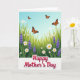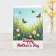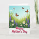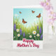 Designed with a bright spring scene, this card shows tall green grass rising toward a calm blue sky, setting a gentle, affectionate mood like a shared walk together ❤️. White, yellow-centered daisy-like flowers dot the foreground, while deep purple flower spikes stand nearby as if growing in friendly clusters. Above them, the sky fades from pale blue near the horizon to a deeper blue overhead, with a few thin, wispy clouds drifting by. Several orange-and-black butterflies glide across the open space, their paths crossing as though they’re dancing around one another. Centered over the sky area is the message “Happy Mother’s Day” in deep red lettering with a white outline, sized large so it’s the first thing you notice. The text has flowing curves and sits slightly above the middle, leaving the flowers and grass fully visible below 🌼. The purple blooms lean upward beside the white flowers, and the butterflies are scattered across the upper half against the blue gradient sky.