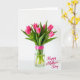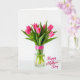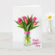 This card features a simple white background with a bouquet of tightly closed flower buds in a clear glass vase, creating a quiet, intimate scene ❤️. The buds glow in rich fuchsia tones, and long emerald-green leaves rise around them as if leaning in together like close friends. Soft, diffused light adds gentle shadows that make the petals and leaves look tender and touchable. A bright pink ribbon with small white polka dots wraps around the upper part of the vase, adding a sweet, affectionate accent 🌼. The green stems are visible through the glass, submerged and slightly magnified by the water. A short greeting appears in the lower right corner in a flowing, dark gray style, kept small so the flowers remain the focus. The vase sits centered on a smooth white surface, with the ribbon’s bow angled slightly to one side.