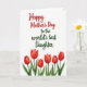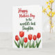 Designed with a bright white background, this card keeps the focus on a loving message and a row of flowers ❤️. Near the top, a large flowing line of text in rich crimson stretches across the upper area, catching the eye first. Just below it, a second line in deep leafy green sits centered and slightly smaller, like a quiet, closer note meant for someone dear. The contrast between the red and green lettering feels like a sweet exchange between two close hearts, warm yet calm. Along the bottom, six cup-shaped red blossoms line up horizontally, painted in soft watercolor washes with gentle see-through edges. Their slender green stems rise neatly, with broad green leaves fanning out to the sides like a protective embrace 🌼. The flowers show subtle shifts from scarlet to deeper red, and the white space around them makes each petal and leaf stand out clearly.