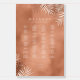 A trendy color palette in shades of terra cotta, copper and rust; sparkling geometric frames and elegant design layouts, provide the basis for this exciting wedding suite. Whether you're planning a destination wedding or staying close to home, this delicate palm leaf design set makes an eye-catching choice. The wedding welcome seating chart shown here provides a template to easily add your own welcome message along with your guest list, names and wedding date. Search ID956 to see other pieces and color choices for this set.