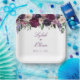 Watercolor flowers in shades of rich burgundy, gentle lilac, deep eggplant purple and pinkish orchid pair with modern green botanicals such as ferns and eucalyptus in these romantic, elegant wedding paper plates.