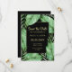 Your wedding guests will be anxious with anticipation after receiving this wildly elegant wedding "Save the Date" card featuring lush tropical leaves and palm fronds surrounding a black rectangular frame. It's a fabulous choice for a beach wedding, destination wedding, luau wedding, or wedding with a tropical theme. Personalize the text in the design template with your details. The reverse side of the card is solid black. You can add additional text on the reverse side if you wish (i.e. your wedding web site info, or any other text you wish to add.) Simply select "customize further" after you have personalized the front of the card.