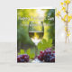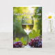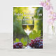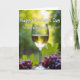 This card features a clear stemmed glass filled with golden liquid, catching tiny highlights that make the scene feel like a shared toast ❤️. Near the base sit two plump clusters of deep purple fruit and a broad green leaf, arranged close together like companions leaning in. Everything rests on a warm, earthy surface that adds a cozy, gathered-around-the-table feel. Behind it, soft greens and pale yellows blur into a sunlit countryside setting, suggesting rows of plants and an easy afternoon glow. The closeness of the fruit and the gentle shine on the glass give the image a quiet, affectionate tone, like friends savoring a calm moment. A short message appears in white lettering across the upper area, standing out clearly against the darker greens. A small accent line of text sits lower on the design in the same white color, balanced near the glass and fruit 🌼. The background transitions from leafy green on the sides to a warm yellow wash near the top, with the glass centered and the purple fruit clustered at the bottom.