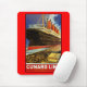 Vintage Cunard Line ocean liner poster showing a stern view of the four-stack RMS Lusitania embarking from the pier.
