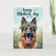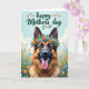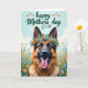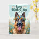 This card features a noble dog with sable-and-tan fur, facing forward with gentle brown eyes that feel like a steady, caring gaze ❤️. A ring of orange and blue flowers with green leaves rests on its head, adding a soft, affectionate touch like a friendly gesture. The dog’s mouth is slightly open with a small pink tongue showing, giving it an easy, welcoming smile. Behind it, the setting fades from rich green ground into a pale blue sky with thin, misty clouds, like a calm spring morning. In the midground, scattered orange and blue wildflowers suggest a shared stroll and quiet companionship 🌼. Near the top, the words “happy Mother’s day” sit centered in dark teal lettering, with small orange accents around the text. Light and shadow along the coat create depth, from darker areas under the chin to warmer highlights along the face and shoulders. Orange and blue blossoms appear again across the field, echoing the wreath against the sky.