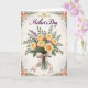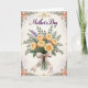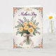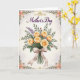 This greeting card features a centered bouquet of golden-apricot roses, their soft petals opening as if offered with quiet affection ❤️. Deep green leaves surround the blooms, with small lavender flowers and tiny red buds tucked in like thoughtful little surprises between close friends. A pale blush pink ribbon is tied neatly around the stems, its gentle shine suggesting careful hands arranged it with care. Behind the bouquet, a light watercolor wash fades from creamy ivory into tender lilac, giving the scene a calm, intimate setting. A thin golden frame outlines the artwork, and each corner is decorated with small peach flowers and fresh green sprigs 🌼. Near the top, a flowing line of text honors a mother figure and the yearly celebration, set in a warm golden color. The lettering sits above the bouquet so the flowers remain the main focus, with generous open space around it. The corners show peach blossoms and leafy accents curling inward along the gold border.