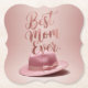 This is a Luxe Best Mom Ever Rose Gold Coaster. The rose gold design was created with generative art. The art features a pink rose gold woman's hat with a pink ribbon. The hat is on a pink rose gold background. Best Mom Ever is in rose gold script above the hat. The coaster is a bracket coaster. The coasters are in a set of 6 pulp board coasters.