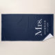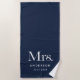 This elegant, minimalist beach towel says "Mrs." in a white, modern, high-fashion luxury font on dark navy blue, and also has a spot for your last name and wedding date.