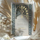 Islamic art is renowned for its emphasis on aniconism and features intricate geometric patterns, calligraphy, and vegetal motifs, known as arabesque. This type of design often includes features such as muqarnas and intricate tilework, which are interpreted in this invitation design. The use of gold foil is reminiscent of traditional Islamic manuscripts and artwork, adding a luxurious element that honors the art's history and cultural significance.