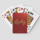 This card features a metallic red playing card design with a gold glitter Lucky script in the center. The design is luxe, modern and stylish. There are 52 cards and 2 jokers in the deck. The cards are easy to shuffle. The card deck would be a great gift for poker players.