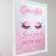 This elegant art print features a soft pink and silver sparkle gradient background, shimmering pink-glitter eyes with luxe lash detail, and glowing neon-style Dream in Pink script, finished with two customizable lines for her name and event title.