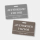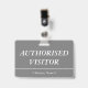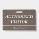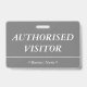 This respectable badge design features the message "AUTHORISED VISITOR", and a customizable company name or other custom message. A badge like this could be used to indicate that a visitor or guest at a workplace is allowed to be there. [~Z0000307]