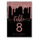 Chic Black and Rose Gold Glitter Wedding Table Number Card featuring faux glitter in shades of rose gold, mauve, and blush pink on an elegant black background. Your details, paired with our modern, chic script typography, makes this the perfect stationery for your elegant affair or wedding. Please contact us at cedarandstring@gmail.com if you need assistance with the design or matching products.