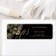 Gold chic and artistic iris flowers painting and fancy lines frame against plain black wedding address label with professional text and typography.