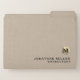 Modern monogram design with stylish brushed metallic gold monogram medallion with personalized name and title below on a beige linen print background. Personalize for your custom use.