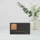 Stylish modern monogram initials and signature script name small business branding business cards featuring a faux metallic gold copper square with initial letters over an elegant black leather like (PRINTED TEXTURE) background.