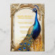 A single large peacock resplendant in color is standing upright on the right side of this invitation and has its tail feathers down. It is framed by a pale marbled beige background adorned with an art nouveau inspired border frame that arches above the peacock. The bird has shimmering blue iridescent chest feathers and its radiant rosettes complete the feel of luxuriant opulence and elegance. Real gold foil editable templates appear across the bird and sparkle and shine a golden hue. The back has the same graphic design with a single template for additional wording. If no additional information is required simply clear the wording. Please note the back template is not foil. This is ideal for a "peacock theme" wedding, bridal shower, engagement, anniversary or couples shower.