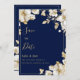 Luxury white gold floral navy blue wedding Save the Date invitations timeless blend of elegance and sophistication, this white and gold floral wedding invitation features delicate botanical accents and shimmering metallic details. The refined navy blue backdrop highlights the intricate gold foiling, creating a radiant and romantic impression. Perfect for couples seeking a classic yet opulent design, it sets the tone for an unforgettable celebration. Exquisite craftsmanship ensures every card feels as special as your day.