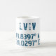 Modern coffee mug design features latitude and longitude coordinates for Lviv, Ukraine in distressed dark blue font