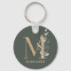 Letter M monogram floral. Letter M in golden brown texture accented with green watercolor compound leaves, flower blossoms and gold dust droplets. Personalized with name in matching font.