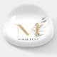 Letter M monogram floral. Letter M in golden brown texture accented with green watercolor compound leaves, flower blossoms and gold dust. Personalize with name in matching font.