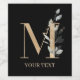Letter M monogram floral. Letter M in golden brown texture accented with green watercolor compound leaves, flower blossoms and gold dust. Personalize with name in matching font.