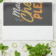 A colorful and playful design featuring the text "Mac and Cheese Please" in a bold, playful font, dripping with melted cheese and sprinkled with breadcrumbs. The design is surrounded by cheesy swirls and macaroni noodles, creating a fun and whimsical kitchen accessory.