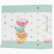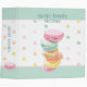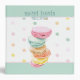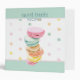 Illustration of a delicately balanced tower of pink, green, orange, brown and yellow macarons. A French specialty and a delicious card or gift for a special friend or anyone who love sweet things.