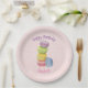 Personalized happy birthday paper plates. Fancy watercolor design of sweet and delicious french macarons stacked up on top of each other. Pretty pastel colors - purple, lime green, yellow, pink and blue. Set on a pink polka dot background.