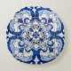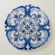 Macau Azulejo Tile Pattern in blue and white transported to the surface of a Round Pillow, preserving its history and tradition. Azulejo is a form of Portuguese or Spanish painted, tin-glazed, ceramic tilework. It has become a typical aspect of Portuguese culture. Portugal imported azulejo tiles from Spain, and their use was widespread in religious and private architecture, particularly on facades.