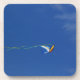 A photograph of a colorful macaw bird kite with ribbons floating in the wind coming from its wings, flying high in the summer blue sky. Photograph Copyright ©Kimberly J Tilley.
