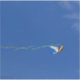 A photograph of a colorful macaw bird kite with ribbons floating in the wind coming from its wings, flying high in the summer blue sky. Photograph Copyright ©Kimberly J Tilley.