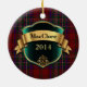 Colorful plaid ceramic ornament, with the traditional red, blue, green, and white clan MacClure tartan plaid pattern, as a background. Graphics of a hunter green and gold tone shield like plaque, has custom black and gold tone text ready to personalize. Great looking family heirloom ornament. Makes a great gift ornament and decoration for other uses around the house.