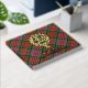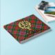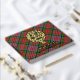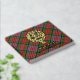 Clan MacPherson crest badge surrounded by a strap and buckle over tartan background. Custom front, back and spine text.
