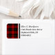 Return address labels with the family tartan for Clan MacQueen and its septs, including MacGuin and Swann. Vintage Scottish plaid pattern dated to 1842 in bright red and black, with yellow gold accents. Matching personalized stationery and envelopes available.