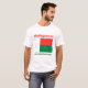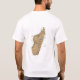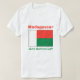 An editable title and slogan accompanies the white vertical next to red and green horizontal bands of the Malagasy flag on the front of this t-shirt. The back displays a detailed map of Madagascar.