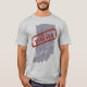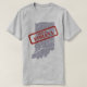 A grunge style graphic design of a Indiana map and a rubber stamp impression with the text "Made in Indiana" by artist/designer Charmaine Paulson on a mens grey t-shirt.