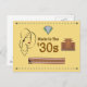 This postcard celebrates the style and fashion of the 1930s with a wide brim cloche style hat, art deco style radio and a film reel to represent the cinema era in muted browns and buff background with geometric border.