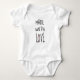 Custom script "made with love" on a baby body suit in elegant handwritten font with pink and gold hearts on a letter which you can choose to delete or leave as is. Customize with the name or year of your choice
