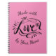 Made with love custom hand lettered recipe spiral notebook. Elegant brush script typography design with your own personalized name. Pink or custom background color. Handy kitchen book for jotting down cooking and baking recipes. Trendy Birthday or Christmas gift idea for friends and family. Unique handmade design.