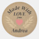 "Personalize" this classic round sticker with "Made with Love from..." on craft paper background, with your name, botanical wreath, and pink heart! Check all options before ordering.