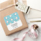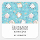 Handmade with love product stickers with a cute cat pattern, set on a blue background and decorated with rainbows and paw prints and more.