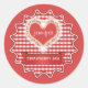 A warm, homey looking sticker design to label your baking or canned goods features the text 'Made with love in my kitchen I hope you enjoy every bite' wrapped around a heart that holds your name. A ribbon banner to hold your product name sits below the heart on a background of gingham in a scalloped circle. See other color options by searching the title 'Made With Love Gingham'.