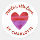 A personalized "Made with love" sticker with a painted red and purple heart on a white colored background. Make it yours by adding your own name. A pretty finishing touch for all of your handmade gifts. Designed for you by Blackberry Boulevard.