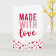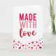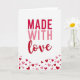 This card features the phrase “MADE WITH love” centered on a bright white background, keeping the focus on a sweet, romantic message 🥰. “MADE WITH” sits on the top line in uppercase sans‑serif letters, with “MADE” in deep crimson and “WITH” in soft rose pink for a gentle shift in tone. Just below, “love” appears larger in flowing calligraphic lettering, returning to rich crimson like a heartfelt signature ❤️. The contrast between the tidy uppercase line and the smooth curves of “love” creates a tender, affectionate look without needing any extra imagery. Along the bottom edge, small hearts scatter in a loose row, varying in size as if they’ve drifted in together. The hearts repeat the same crimson and rose shades, adding a soft rhythm that guides your eye across the base of the design. The white space around the words stays open and uncluttered, while the heart accents form a simple border at the bottom.