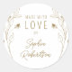 Made with Love Personalized Line Art Floral Sketch Classic Round Sticker Product Label... A stylish gold and white round sticker for your handmade gifts, home-baked foods, or homemade products for sale. Line art floral sketches border the text which reads "Made with Love by" followed by your name in trendy script typography. You can easily change the name and all other text on the personalization template.