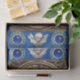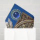 Elegant classic,vibrant Renaissance fine art ,masterpiece from Bottega della Robbia ( Florence - Italy ) in white,blue ,green,brown colors.An antique nativity scene,winged cherubs in blue sky on a bright yellow,green decorative ornamental floral crown with 3D blue sapphire gemstones,