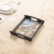 This is a well made, sturdy wooden tray with a flawless black finish and lovely map on the tray surface. It is both vintage & modern at the same time. Looks exactly like the photo; does not disappoint. So nice to find something of quality individually made and not the mass-produced 'shabby chic' merchandise seen in stores. I am so pleased to be able to give this to my college-age niece for her birthday. This can be used as a tray to hold jewelry or toiletries, or hung on the wall as art. The map surface is sealed (it is slightly shiny) so would be moisture resistant. It is well worth the asking price but I was able to apply a sale code as well. Very happy with my purchase. Map is crisp & clear and sealed with a water-resitant finish.