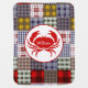 A baby blanket featuring an illustration of a crab over a madras plaid patchwork inspired background. Personalize with name.
