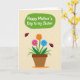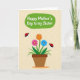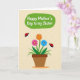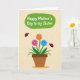 This card features a potted green plant in a rustic brown container, with three cheerful flowers—one orange, one magenta, and one sky blue—each with a sunny yellow center that draws the eye. Two small winged insects hover on either side, their red bodies dotted with black spots as they seem to circle the blooms like friendly companions ❤️. The beige background has a soft, slightly textured look that keeps the scene cozy and gentle. Near the top, an organic, rounded green banner stretches across the width, carrying a short Mother’s Day greeting in white letters. The simple shapes and crisp outlines make the flowers feel fresh and inviting, like a small gift being offered with a tender glance. The bright petals and the paired insects add a sweet, affectionate energy, as if the little visitors are sharing the moment together 🌼. Tiny abstract shapes repeat faintly across the background behind the pot and banner.